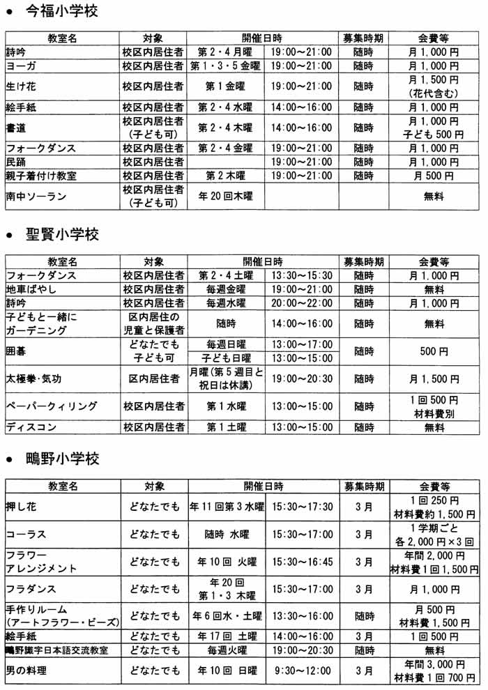 《詩吟》成育小PTA詩吟クラブ場所:成育小学校(成育1-5-19)日時:月曜19:30〜21:30 会費:月1 , 5 0 0 円他に教材費 対象:成育小枝下及び近隣の皆様 募集時期:随時(見学○Kです) 連絡先:垣本嘉久( 寛耕) 電話 6932-7477 ★関西詩吟文化協会研修の詩歌を学び楽しみ ます。 |