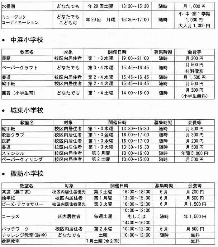 諏訪ソフトテニスクラブ場所:諏訪小学校運動場(永田2-15.5)日時:日曜13:00〜15:00 会費:年会費2,000円 スポーツ保険代1,600円 対象:諏訪・東中浜小学校下居住者 募集時期:随時 連絡先:松本光平 電話 6961-0605 ★前半は基礎練習、後半は試合形式の練習。 |