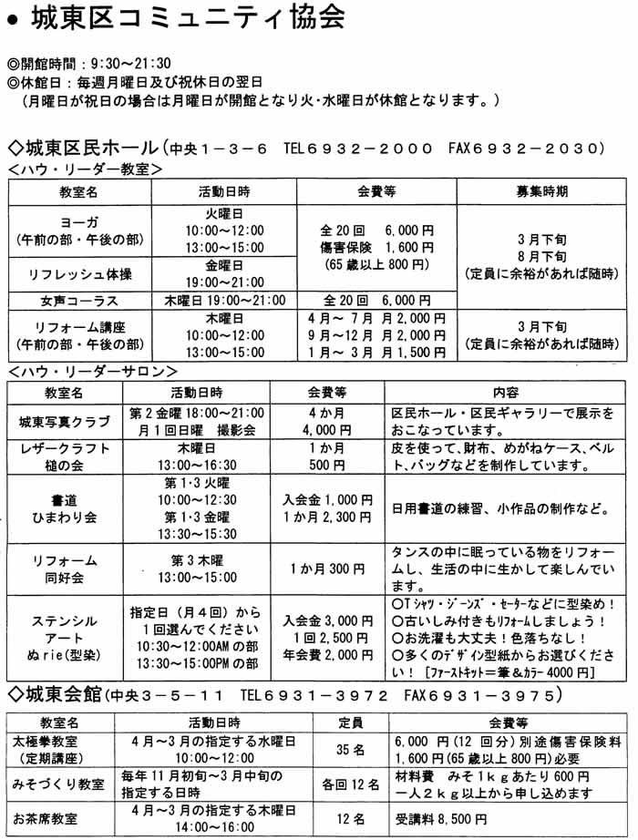 合唱団JO−9場所:城東会館(中央3-5-11)又は区民ホール(中央1-3-6) 日時:原則、 第2.4土曜日14:00〜16:00 第2.4火曜19:00〜21:00 (但し9月〜2月の間のみ) 会費:月2,000円 対象:城東区民及び城東区に勤務され ている方、他関連のある方々 募集時期:随時 連絡先:城東区コミュニティ協会 電話 6932-2000(城東区民ホール内) ★〈城東区1000人の第九〉を目指して活動 しています。ベートーヴェンの第9を歌いましょう! |