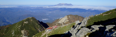 写真は聖岳(3013m)の山頂からダイナミックな雲の向こうに見える富士山を撮影したものです。富士山頂の右端は尖頭が富士の剣が峰で、日本の最高峰(3776m)です。
