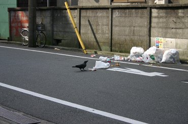 大阪の都心は、東京の都心に比べてからすによる被害が少ない。その意外な理由は飲食店等のごみにあった。東京では飲食店の食べ残しの入ったごみは家庭ごみと同じ午前8時から収集を始める。実は、そのときにはカラスはすでに朝食を済ませているのだ。一方、大阪では飲食店のごみは午前3時から収集を始める。まだ、カラスが寝ている時間帯だ。だからカラスは朝食をとりに郊外まで出かける。その裏には、大阪のごみ焼却場が深夜もごみを受け付ける事情がある。東京も見習って欲しいものだ。