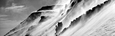 1971年12月13日冬山の訓練の時撮影した富士山です。6合目、7合目で滑落停止の訓練をしていました。吉田大沢はまだ柔らかい雪があり ましたが、夏の登山道は雪はなく、カチカチに凍った氷でアイゼンやピッケルも跳ね返す程の固さです。訓練の最後は山頂への登頂でした。凍結し た夏道を登ると、突風が近づいてくるのがわかります。「突風!」の掛け声で、全員が耐風姿勢を取ります。アイゼンとピッケルでしっかり三角形 で支え、背を低くして飛ばされないようにし、突風の行き過ぎるのを待ちます。突風が行きすぎるとまた、歩きます。 この写真は頂上直下の強風に雪が舞う様子です。狛犬が見えます。 麓からみると、この舞っている雪は青空にくっきりと雪煙として見えるはずです。