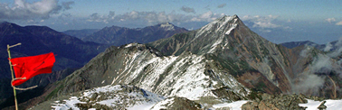この写真は農鳥岳からピラミッドのような北岳と縦走路を写したものです。山は冬支度の装いでした。赤い三角の旗はその年の正月に此処を縦走しようとする山岳会が目印に立てたものでしょう。強風にはためいて冬の到来を待っているようでした。遠くに甲斐駒ケ岳、北岳の左側に、かすかに八ヶ岳がみえます。北岳から農鳥岳迄の稜線は日本でも有数の3000mを越える稜線です。