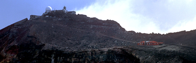 白いドームは富士山の剣ヶ峰に立つ気象レーダー、富士山の火口の平らな場所 にある赤い建物は気象庁の建屋。富士山のブルドーザ道はこの時に作られまし た。
