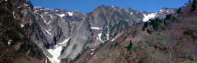 谷川岳 一ノ倉沢の全景です。魔の山として日本では良く知られています。私も、上越線の夜行で上野から数十回チャレンジしました。勝率は5割以下です。雨と吹雪です。